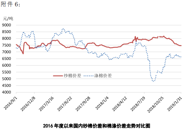 本周,受美國政府重新開門、美聯(lián)儲(chǔ)未加息提振,美股上漲,國際棉價(jià)跟漲。2019年1月28日-2月1日,紐約棉花期貨主力合約結(jié)算價(jià)74.08美分/磅,較上周上漲0.6美分/磅,漲幅0.82%,代表進(jìn)口棉中國主港到岸均價(jià)的國際棉花指數(shù)(M)為83.17美分/磅,較上周上漲0.58美分/磅,漲幅0.7%,折人民幣進(jìn)口成本14429元/噸,較上周上漲97元/噸,漲幅0.68%;內(nèi)外棉價(jià)差1051元/噸,較上周縮小91元/噸。(詳見附件1)