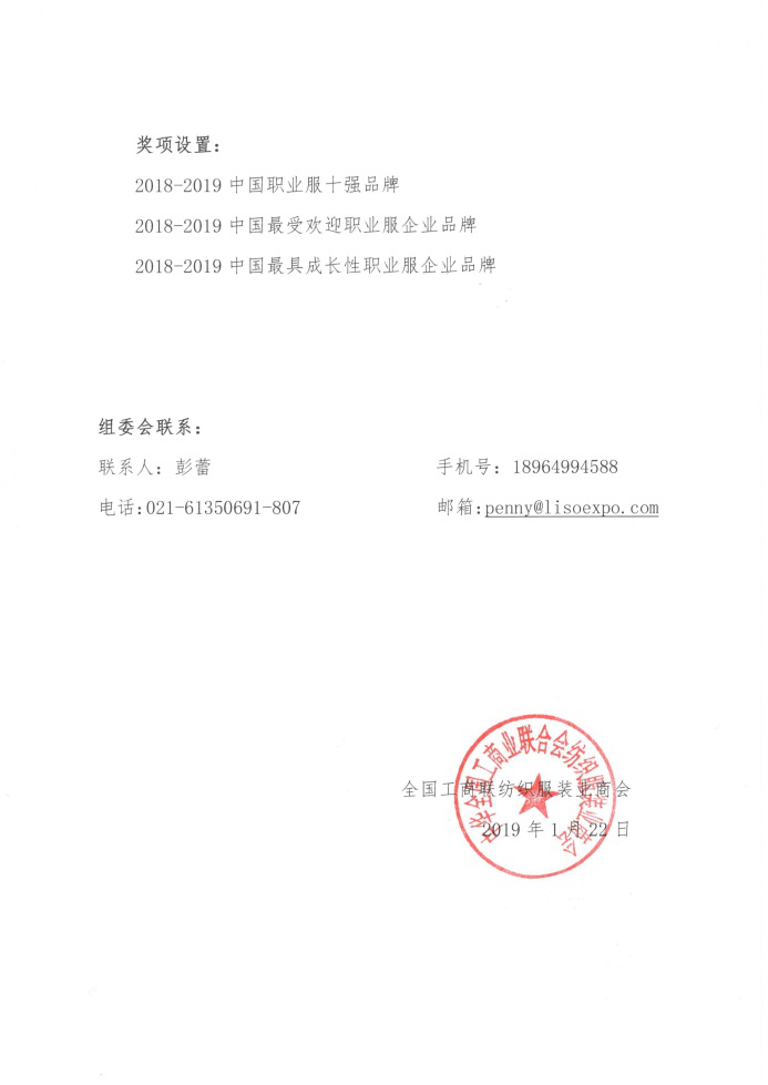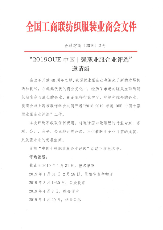5.結(jié)果公示:主辦方將于2019年4月20日在OUE中國十強(qiáng)職業(yè)服企業(yè)評選頒獎晚宴進(jìn)行頒獎。