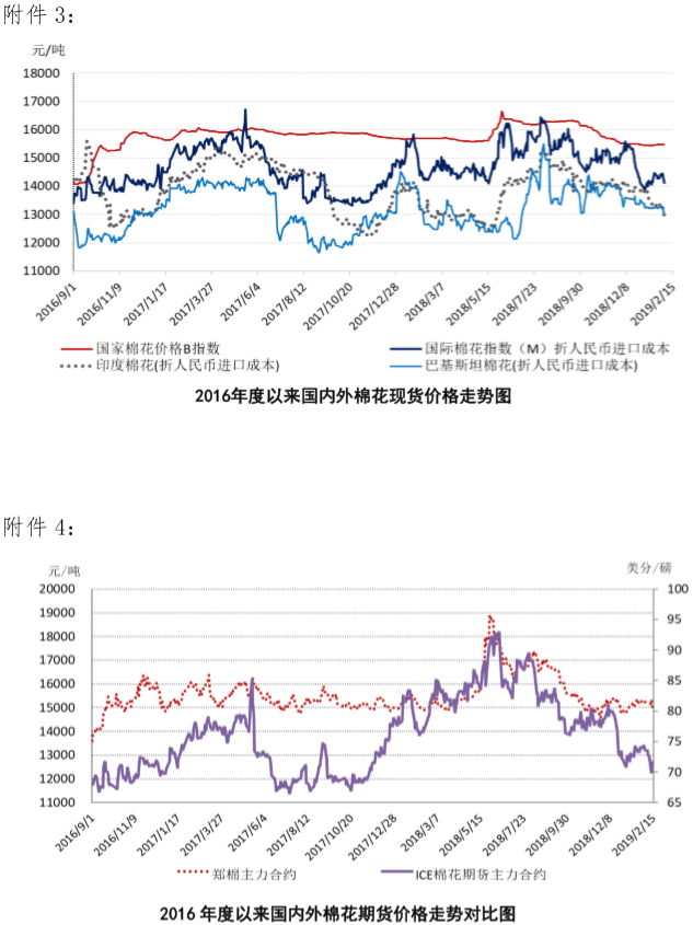 本周,國內(nèi)節(jié)日氣氛尚未完全消散,市場交投冷清,國內(nèi)皮棉現(xiàn)貨價(jià)格報(bào)價(jià)弱穩(wěn),鄭棉期貨跟隨ICE下跌。2019年2月11-15日,代表內(nèi)地標(biāo)準(zhǔn)級皮棉銷售均價(jià)的國家棉花價(jià)格B指數(shù)15477元/噸,較上周下跌4元/噸,跌幅0.02%;鄭州棉花期貨主力合約結(jié)算價(jià)15130元/噸,較上周下跌122元/噸,跌幅0.8%。