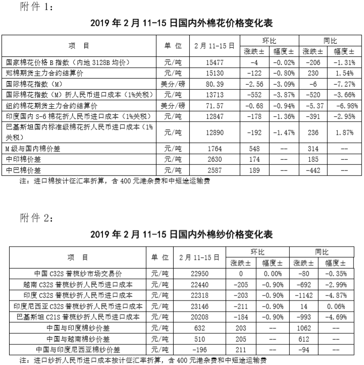 附件1:2019年2月11-15日國內(nèi)外棉花價(jià)格變化表