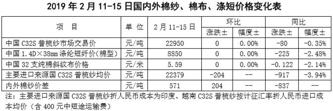 附件2:2019年2月11-15日國內(nèi)外棉紗價(jià)格變化表