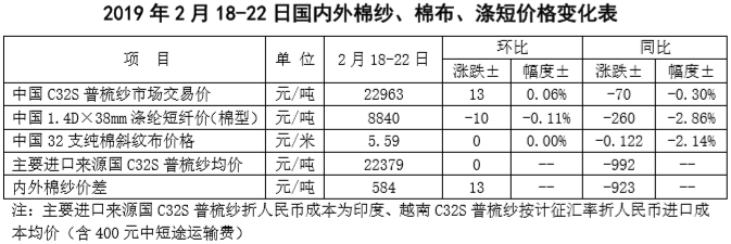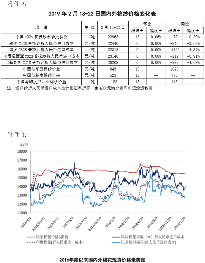 附件2:2019年2月18-22日國內(nèi)外棉紗價格變化表