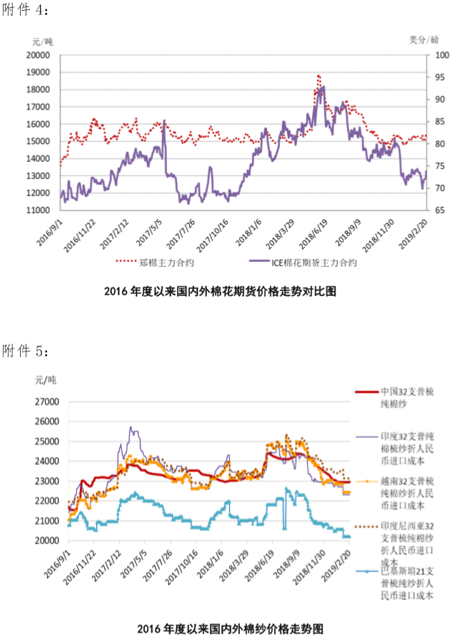 本周,中美貿(mào)易談判預期向好,積極情緒提振國際棉價上漲。2019年2月18-22日,紐約棉花期貨主力合約結算價72.84美分/磅,較上周上漲1.27美分/磅,漲幅1.78%,代表進口棉中國主港到岸均價的國際棉花指數(shù)(M)為80.94美分/磅,較上周上漲0.55美分/磅,漲幅0.68%,折人民幣進口成本13804元/噸,較上周上漲90元/噸,漲幅0.66%;內(nèi)外棉價差1674元/噸,較上周縮小89元/噸。(詳見附件1)