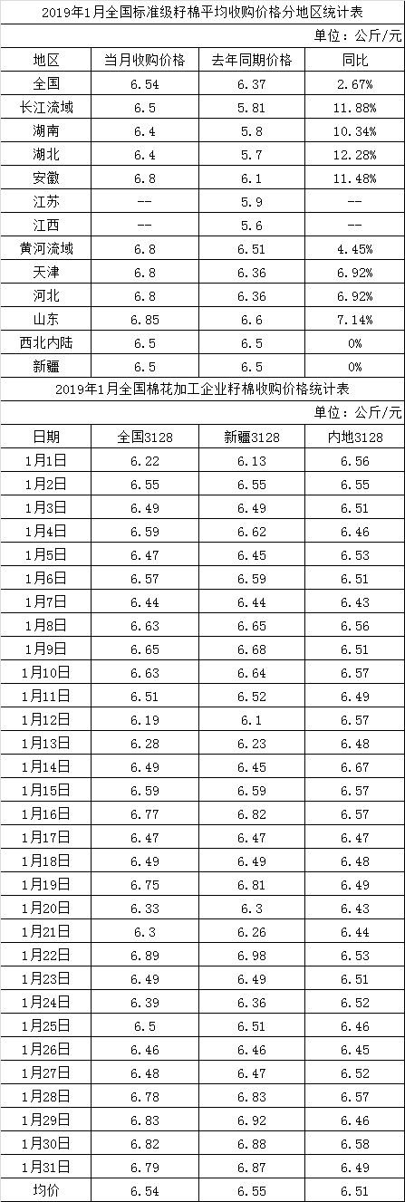 1月,全國400型棉花加工企業(yè)3128級籽棉平均收購價(jià)格為6.54元/公斤,較上期基本持平,同比上漲2.67%。疆棉收購、加工逐步結(jié)束,籽棉收購價(jià)格由上月的6.48元/公斤上漲到6.5元/公斤,同比基本持平;長江流域隨著紡織企業(yè)的補(bǔ)庫以及期貨上漲的帶動,籽棉收購價(jià)格有所上漲,收購價(jià)格為6.5元/公斤,環(huán)比上漲0.78%,同比上漲11.88%;黃河流域籽棉收購全面結(jié)束,棉農(nóng)交售積極性高漲,收購價(jià)格為6.8元/公斤,環(huán)比下跌1.02%,同比上漲4.45%。