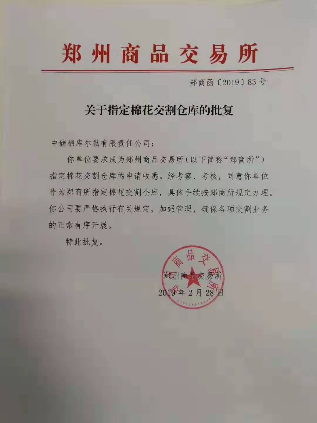 2019年2月28日,鄭州商品交易商批準中儲棉庫爾勒有限責任公司成為鄭州棉花期貨指定交割倉庫,具體見下圖。