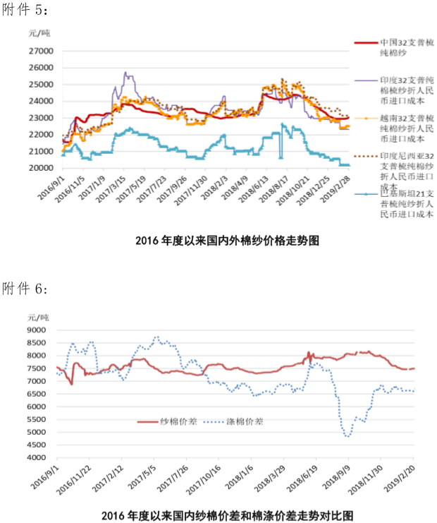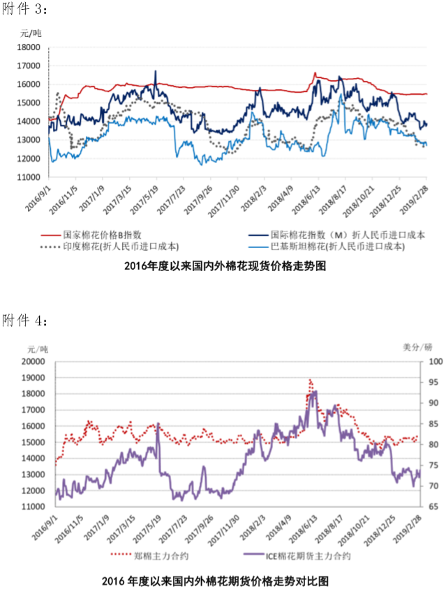 本周,特朗普推遲對中國加征關(guān)稅期限,國際市場避險情緒有所改善,提振國際棉價整體上漲。2019年2月25日-3月1日,紐約棉花期貨主力合約結(jié)算價73.85美分/磅,較上周上漲0.84美分/磅,漲幅1.15%,代表進口棉中國主港到岸均價的國際棉花指數(shù)(M)81.21美分/磅,較上周上漲0.28美分/磅,漲幅0.34%,折人民幣進口成本13847元/噸,較上周上漲44元/噸,漲幅0.32%;內(nèi)外棉價差1629元/噸,較上周縮小46元/噸。(詳見附件1)