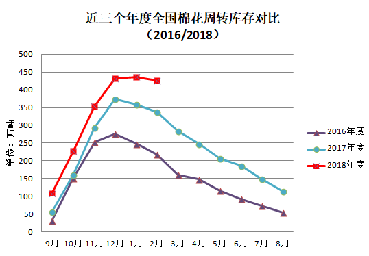 2月受春節(jié)放假影響,紡織企業(yè)實際采購和用棉量均環(huán)比下降,但由于新棉入市基本結(jié)束,月末全國棉花周轉(zhuǎn)庫存有所下降。據(jù)中國棉花協(xié)會棉花物流分會對全國18個省市的186家棉花交割和監(jiān)管倉庫調(diào)查數(shù)據(jù)顯示:2月底全國棉花周轉(zhuǎn)庫存426.08萬噸,較上月減少10.27萬噸,降幅2.4%,這是本年度以來周轉(zhuǎn)庫存首次下降。
