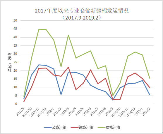 2018年9月-2019年2月出疆棉公路與鐵路共發(fā)運122.70萬噸,同比減少59.87萬噸。