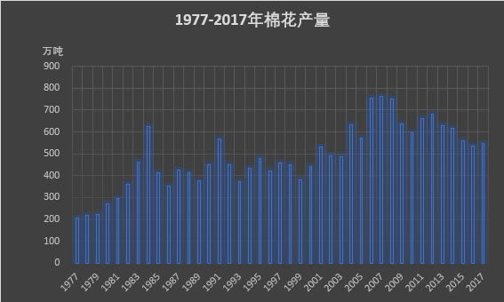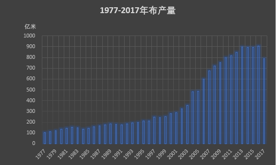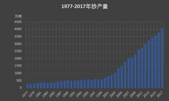 據(jù)國家統(tǒng)計局公報資料顯示,2017年我國紗線產(chǎn)量4033萬噸,是1978年的近17倍,40年年均增長7.8%,其中2005年以前年均增長6.2%,2005年以后年均增速高達11.3%。據(jù)測算,2017年我國棉紡規(guī)模超過1.55億錠,比1978年的1300萬錠增長近11倍。2017年我國坯布產(chǎn)量達788億米,比1978年增長7倍以上。