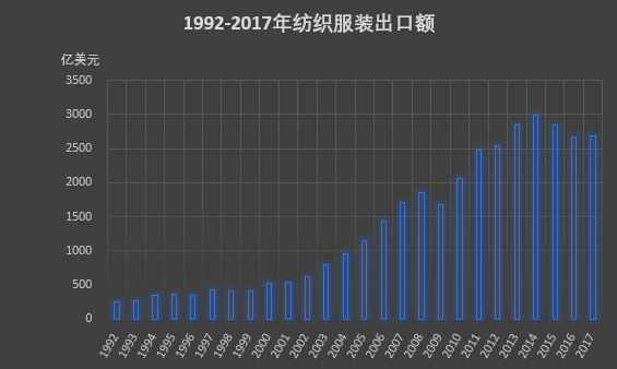 1、紡織服裝出口增長10倍,出口規(guī)模穩(wěn)居全球第一。據(jù)海關(guān)統(tǒng)計資料顯示,2017年我國紡織服裝出口2686億美元,比1992年增長10倍,25年年均增速達10%以上,其中2004-2014年增速超過12%。值得關(guān)注的是,受金融危機及全球經(jīng)濟復蘇緩慢等因素影響,2014年以后紡織服裝出口出現(xiàn)增速減緩或負增長,其中2015-2016兩年環(huán)比分別下降4.9%和5.9%,2017年微增0.5%,出口增速放緩跡象較明顯。