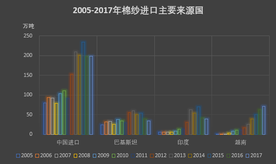 從棉紗進口來源國看,主要是巴基斯坦、印度、越南,越南已取代巴基斯坦成為我國棉紗進口第一來源國。2017年我國自越南進口71.6萬噸(2005年僅0.42萬噸),占我國進口總量比重36.1%(2005年僅0.5%);2017年自印度進口39.07萬噸,比2005年增長6.4倍,比重19.7%,比2005年提高13個百分點;2017年自巴基斯坦進口34.05萬噸,比2005年增長38.1%,比重17.2%,比2005年減少13.9個百分點。