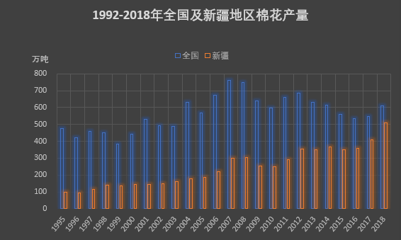 1、政策調(diào)整,新疆棉花快速發(fā)展。2014年在新疆地區(qū)試行棉花目標價格政策。由于這一政策是將目標價格與市場價格的差額部分直接補貼給棉農(nóng),大大調(diào)動棉農(nóng)積極性,新疆棉花生產(chǎn)能力得以大幅提升。據(jù)國家統(tǒng)計局最新公布的調(diào)查和測量的資料顯示,2018年新疆棉花產(chǎn)量達511.1萬噸,是1992年99.4萬噸的5.1倍,比2014年的367.7萬噸增長39%。占全國棉花總量比重由1992年的20.9%上升到2014年的60%,2018年達83.8%。內(nèi)地棉花生產(chǎn)能力則大幅萎縮,2018年內(nèi)地棉花產(chǎn)量僅98.5萬噸,比1992和2014年下降73.7%和60.3%,比重也由1992年的79.1%、2014年的40%減少到2018年的16.2%。