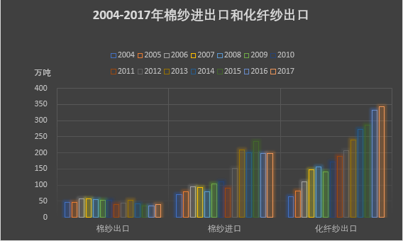 2、棉紗進口增長1.2倍、出口萎縮,化纖紗出口增長4.4倍。受內(nèi)外棉花價差擴大和勞動力成本上升等因素影響,近幾年來我國紗線進出口結(jié)構(gòu)有一定變化,棉紗進口和化纖紗出口大幅增加,棉紗出口出現(xiàn)萎縮。2017年我國紗線出口473.77萬噸,比2004年增長2.4倍。其中化纖紗出口344.17萬噸,比2004年增長4.4倍,年均遞增13.8%,棉紗出口39.32萬噸,比2004年下降14.7%,年均遞減1.2%。2017年棉紗進口198.35萬噸,比2004年增長1.8倍,年均增長8.2%。尤其是2013年以后棉紗進口保持200萬噸左右,其中2015年高達234.55萬噸。
