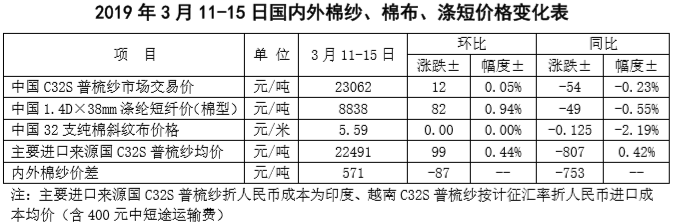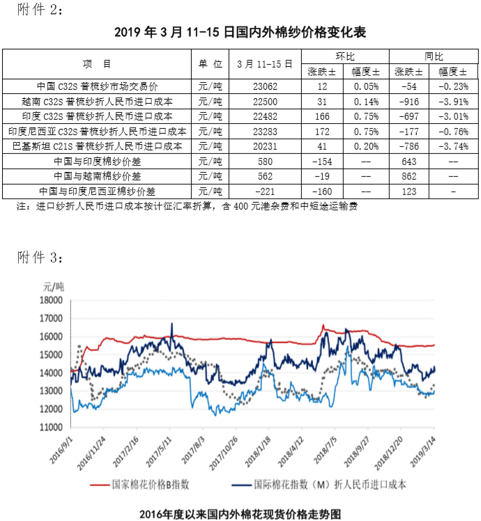 附件2:2019年3月11-15日國內外棉紗價格變化表