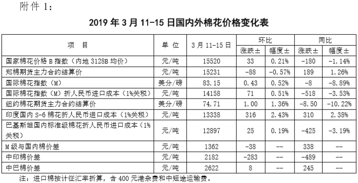 附件1:2019年3月11-15日國內外棉花價格變化表