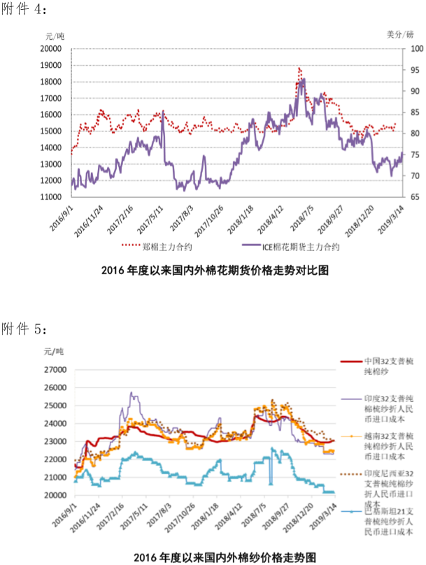 本周,美元指數創(chuàng)3個月來最大單周跌幅,商品市場反彈,國際棉花價格振蕩收漲。2019年3月11-15日,紐約棉花期貨主力合約結算價74.71美分/磅,較上周上漲1美分/磅,漲幅1.36%,代表進口棉中國主港到岸均價的國際棉花指數(M)83.15美分/磅,較上周上漲0.43美分/磅,漲幅0.52%,折人民幣進口成本14158元/噸,較上周上漲71元/噸,漲幅0.51%;內外棉價差1362元/噸,較上周縮小38元/噸。(詳見附件1),
