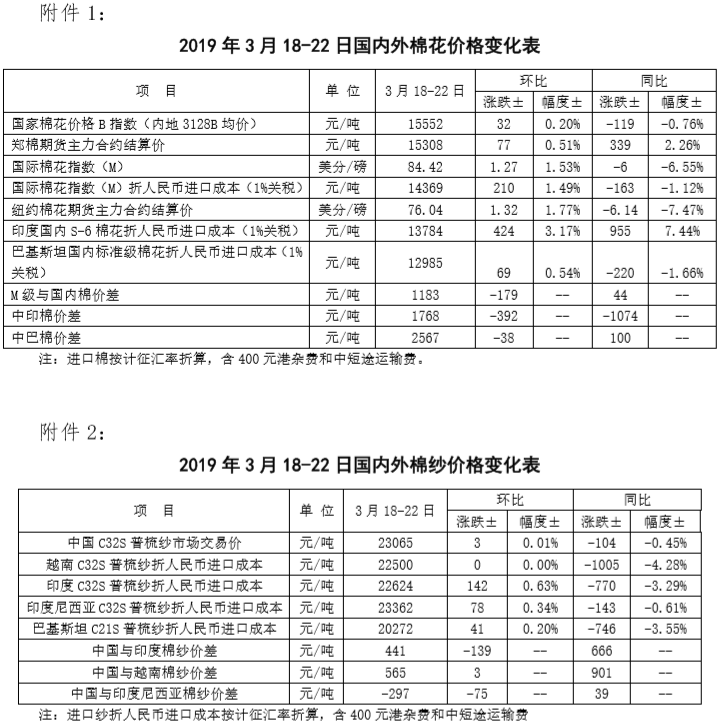 附件1:2019年3月18-22日國內(nèi)外棉花價(jià)格變化表