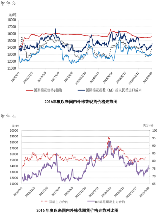 本周,美聯(lián)儲(chǔ)宣布維持利率不變,暗示今年不會(huì)再加息,引發(fā)美元指數(shù)一度回落,促使國際棉花價(jià)格整體上漲。2019年3月18-22日,紐約棉花期貨主力合約結(jié)算價(jià)84.42美分/磅,較上周上漲1.27美分/磅,漲幅1.53%,代表進(jìn)口棉中國主港到岸均價(jià)的國際棉花指數(shù)(M)84.42美分/磅,較上周上漲1.27美分/磅,漲幅1.53%,折人民幣進(jìn)口成本14369元/噸,較上周上漲210元/噸,漲幅1.49%;內(nèi)外棉價(jià)差1183元/噸,較上周縮小179元/噸。(詳見附件1)