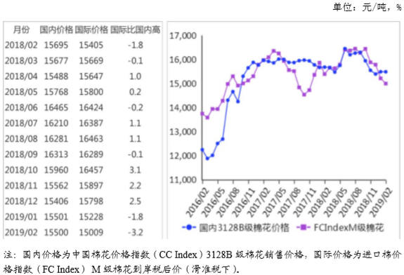 (一)國內(nèi)棉價基本持平。2月中上旬,紡織企業(yè)進(jìn)入春節(jié)假期,市場購銷清淡,棉價先穩(wěn)后跌;下旬企業(yè)逐漸開工,中美經(jīng)貿(mào)磋商取得進(jìn)展,市場主體信心有所恢復(fù),棉花消費增加,價格開始回升。2月,國內(nèi)3128B級棉花月均價每噸15500元,環(huán)比持平,同比跌1.2%。鄭棉期貨主力合約CF905月結(jié)算價每噸15230元,環(huán)比跌0.3%,同比漲0.2%。
