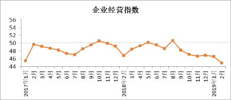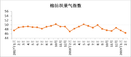 2月企業(yè)經(jīng)營(yíng)指數(shù)44.90,與1月相比下降1.69。2月,受春節(jié)假期影響,企業(yè)生產(chǎn)銷售放緩。春節(jié)后用工減少已成普遍現(xiàn)象,企業(yè)反映工人工資水平不斷提高,加上社保新征收體制改革后,預(yù)計(jì)企業(yè)人工成本將大幅增加。為此,企業(yè)積極進(jìn)行設(shè)備改造升級(jí),但被融資難、融資貴等一系列問題所困擾,市場(chǎng)信心受到打擊。目前,中美磋商取得進(jìn)展,但最終仍不明朗,市場(chǎng)對(duì)于儲(chǔ)備棉拋儲(chǔ)的傳聞不斷,行業(yè)高度關(guān)注,希望國(guó)家能盡快釋放信號(hào),穩(wěn)定市場(chǎng)。