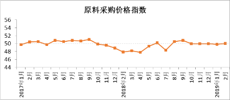 2月原料采購價(jià)格指數(shù)50,與1月相比上升0.18。2月,春節(jié)假期,上旬棉花市場(chǎng)交易基本停滯,下旬由于中美貿(mào)易談判取得進(jìn)展、紡織企業(yè)陸續(xù)開工對(duì)棉花需求量逐漸回升等原因,對(duì)棉花價(jià)格起到支撐作用,棉價(jià)小幅上漲。2月,CotlookA指數(shù)平均值81.15美分/磅,環(huán)比下降1.2美分/磅;國(guó)內(nèi)3128B級(jí)棉花現(xiàn)貨均價(jià)為15159元/噸,環(huán)比增加105元/噸。節(jié)后滌綸短纖報(bào)價(jià)穩(wěn)中偏強(qiáng),粘膠短纖市場(chǎng)維持以往慣例,上調(diào)報(bào)價(jià)。2月,主流粘膠纖維均價(jià)為13445元/噸,環(huán)比增加150元/噸;1.4D直紡滌短均價(jià)為8866元/噸,環(huán)比增加67元/噸。3月,棉花價(jià)格延續(xù)小幅上漲態(tài)勢(shì),化纖短纖價(jià)格走弱,預(yù)計(jì)3月原料采購價(jià)格指數(shù)與2月基本保持平穩(wěn)。
