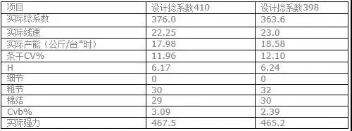由以上產(chǎn)量公式可以看出,細(xì)紗捻度的大小也是影響產(chǎn)量的關(guān)鍵因素,例如C 20 S 設(shè)計(jì)捻系數(shù)由410降為398,臺(tái)時(shí)產(chǎn)能提高3.2%。生產(chǎn)質(zhì)量數(shù)據(jù)如表1所示: