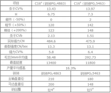 鋼領(lǐng)的直徑大小影響紡紗速度,以下是使用直徑?48與?54的鋼領(lǐng)紡C16s產(chǎn)質(zhì)量的對(duì)比數(shù)據(jù):見表2。
