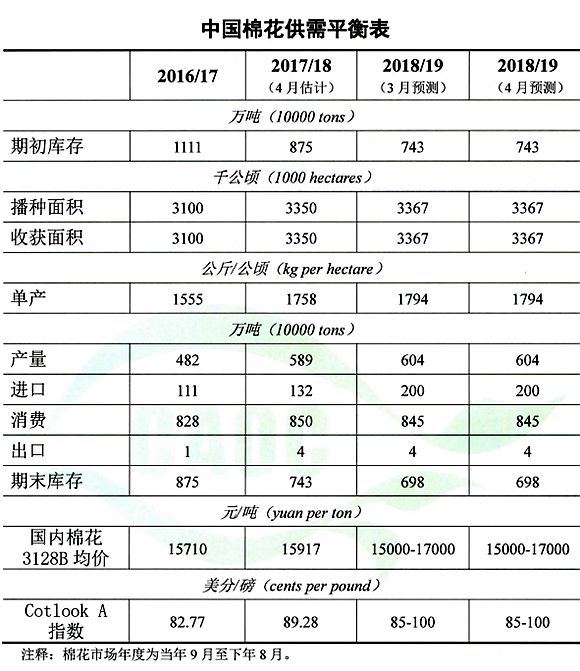 棉花:本月預(yù)測,2018/19年度中國棉花產(chǎn)銷存數(shù)據(jù)均維持上月預(yù)測值不變。本年度中國棉花已進(jìn)口111萬噸,同比增加91%。2019年1-2月中國紡織品服裝出口382億美元,同比下降12%。中國棉花年度產(chǎn)需缺口將得到有效補(bǔ)充,市場價(jià)格趨穩(wěn)。
