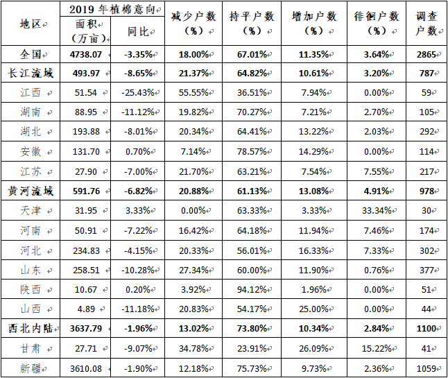 2019年3月中國棉花協(xié)會(huì)棉農(nóng)分會(huì)對全國12個(gè)省和新疆自治區(qū)共2865個(gè)定點(diǎn)農(nóng)戶進(jìn)行第三次2019年植棉意向調(diào)查。結(jié)果顯示:全國植棉意向面積4738.07萬畝,同比下降3.35%,較上期預(yù)測的3.58%,回升0.23個(gè)百分點(diǎn)。其中新疆棉農(nóng)種植意向同比下降1.90%,降幅較上期縮小1.09個(gè)百分點(diǎn);黃河流域同比下降6.82%,降幅較上期擴(kuò)大2.06個(gè)百分點(diǎn);長江流域同比下降8.65%,降幅較上期擴(kuò)大2.89個(gè)百分點(diǎn)。隨著氣溫回升,棉農(nóng)普遍開始備耕,植棉意向也日漸明確。
