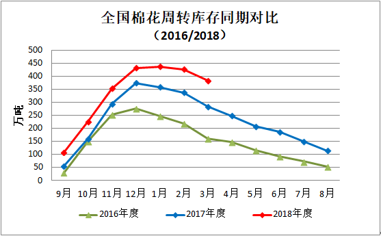 3月中美貿(mào)易磋商順利推進,市場心態(tài)受到鼓舞,加上企業(yè)有補庫需求,市場購銷活躍,月末全國棉花周轉(zhuǎn)庫存大幅下降。據(jù)中國棉花協(xié)會棉花物流分會對全國18個省市的164家棉花交割和監(jiān)管倉庫調(diào)查數(shù)據(jù)顯示:3月底全國棉花周轉(zhuǎn)庫存382.56萬噸,較上月減少43.52萬噸,降幅10.21%,降幅較上月擴大7.86%;同比仍高99.31萬噸,幅度為35.06%。