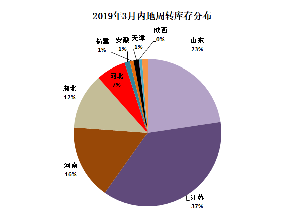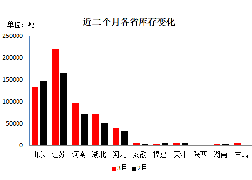 從各省庫存分布情況看:江蘇省庫存量繼續(xù)保持首位,為22.14萬噸,山東省次之13.5萬噸,河南省居第三位9.75萬噸,湖北省7.31萬噸,河北省3.91萬噸,其他省在萬噸以下。