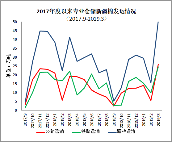 2018年9月-2019年3月出疆棉公路與鐵路共發(fā)運173.27萬噸,同比減少50.59萬噸。