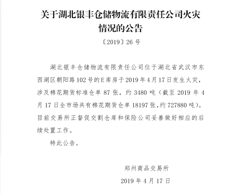 隨后鄭商所及時(shí)進(jìn)行信息披露,在其官網(wǎng)及對媒體發(fā)布公告稱,湖北銀豐倉儲(chǔ)物流有限責(zé)任公司位于湖北省武漢市東西湖區(qū)朝陽路102號的E庫房于2019年4月17日發(fā)生火災(zāi),涉及棉花期貨標(biāo)準(zhǔn)倉單87張,約3480噸。