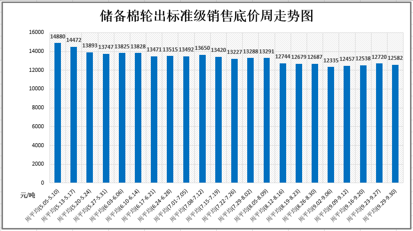 根據(jù)國家糧食和物資儲備局、財政部公告(2019年第1號)對中央儲備棉輪出銷售底價計算公式,第22周(9月29-30日)標(biāo)準(zhǔn)級銷售底價12582元/噸,較上周下調(diào)138元/噸;每日上市實際批次儲備棉銷售底價,以標(biāo)準(zhǔn)級銷售底價為依據(jù),按棉花公證檢驗結(jié)果及中國棉花協(xié)會公布的有關(guān)質(zhì)量差價表計算確定。2019年9月中棉協(xié)《國產(chǎn)棉質(zhì)量差價表》