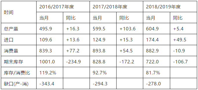 如表1所示,至2016/17年度時(shí),我國期末庫存降至1001萬噸(庫消比119%)。到如今,2018/19年度時(shí),我國期末庫存將再降至722萬噸(庫消比81%)。