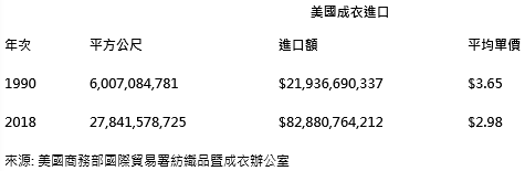 此外多年來這些產(chǎn)品單價已大幅下降,據(jù)美國商務部國際貿(mào)易署紡織品暨成衣辦公室(OTEXA)數(shù)據(jù),美國進口服裝總體平均價格從1990年的每平方米3.67美元下降到2018年的2.98美元。