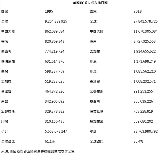透過美國進口統(tǒng)計數(shù)據(jù),我們可以清楚地看到此一現(xiàn)象。WTO于1995年成立以來,美國10大成衣進口國占全球輸往美國成衣進口總額的61.1%。2018年此一數(shù)字已躍升至85.4%。許多曾被列為十大供應國都發(fā)生變化: