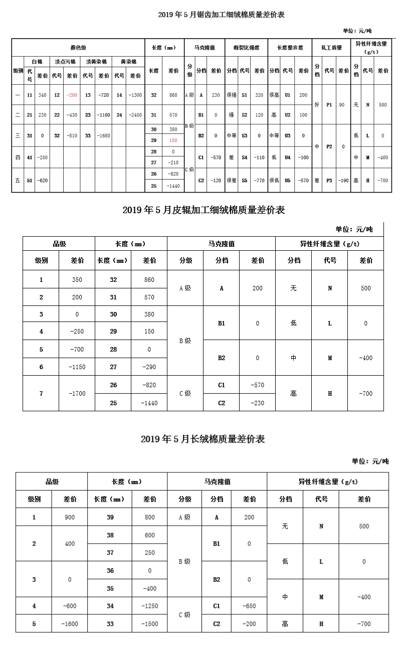 依據(jù)2019年4月的棉花公檢質(zhì)量數(shù)據(jù)、中國棉花協(xié)會棉花質(zhì)量價差自動生成系統(tǒng)采集的棉花加工企業(yè)銷售成交價、紡織企業(yè)監(jiān)測點的采集數(shù)據(jù)以及當月的中國棉花價格指數(shù),2019年5月鋸齒加工細絨棉質(zhì)量差價調(diào)整數(shù)據(jù)據(jù)此生成,并征求行業(yè)內(nèi)質(zhì)檢、貿(mào)易、紡織、期貨、地方協(xié)會等相關(guān)專家的意見,現(xiàn)對《鋸齒加工細絨棉質(zhì)量差價表》做出如下調(diào)整(單位:元/噸):