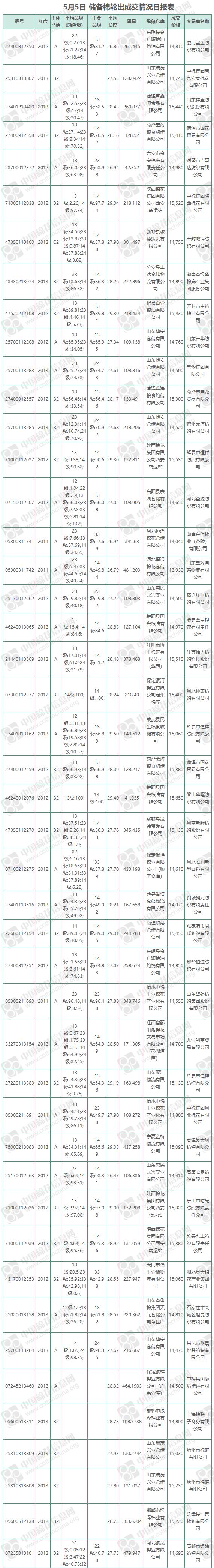 5月5日儲備棉輪出銷售資源10027.4533噸,實際成交10027.4533噸,成交率100%,成交均價14893元/噸,折3128價格16220元/噸。