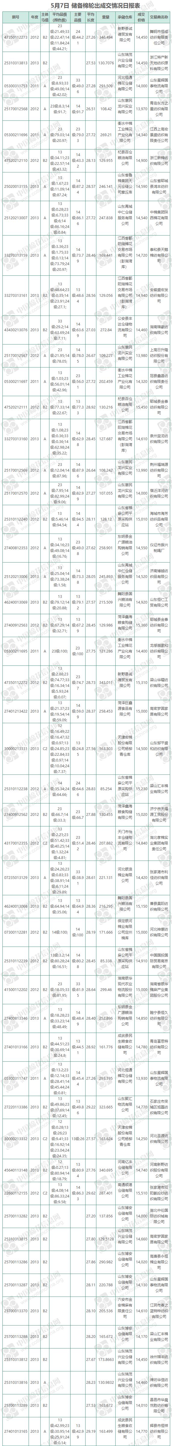5月7日儲備棉輪出銷售資源10016.0599噸,實(shí)際成交10016.0599噸,成交率100%,成交均價14614元/噸,較6日下跌59元/噸;折3128價格16041元/噸,較6日下跌44元/噸。