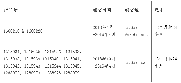 此次召回的產(chǎn)品于2018年4月-2019年4月在加拿大銷(xiāo)售,此次召回涉及產(chǎn)品約96286件。
