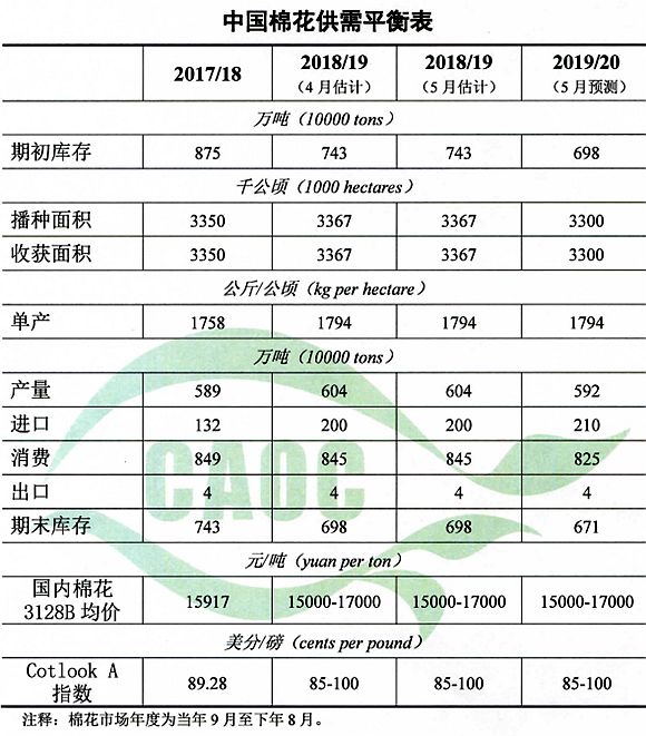 棉花:本月預(yù)測,2019/20年度中國棉花播種面積3300千公頃,較上年度減少2.0%。主要由于植棉成本上升,勞動力短缺,棉花補(bǔ)貼政策調(diào)整方向不明朗,棉農(nóng)植棉積極性下降。棉花單產(chǎn)每公頃1794公斤,與上年基本持平。棉花產(chǎn)量592萬噸,較上年度減少2.0%。棉花進(jìn)口量210萬噸,較上年度增長10萬噸。棉花消費量825萬噸,較上年度減少2.3%。新年度國內(nèi)外棉花供給總體穩(wěn)定,預(yù)測2019/20年度國內(nèi)3128B級棉花均價仍保持在每噸15000-17000元區(qū)間,CotlookA指數(shù)均價在每磅85-100美分區(qū)間運行。
