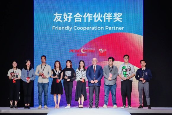 ??▲深圳市鵬城展覽策劃有限公司總經(jīng)理,深圳原創(chuàng)設(shè)計(jì)時(shí)裝周主席張建和法國(guó)智奧會(huì)展集團(tuán)Première Vision品銳至尚展總經(jīng)理Gilles Lasbordes為昆山昭奈華裕服裝有限公司、杭州關(guān)耳文化創(chuàng)意有限公司、卡仕文服飾(深圳)有限公司、浙江依極時(shí)裝有限公司、益盛(福建)紡織科技發(fā)展有限公司、廣東菜根科技股份有限公司、寧波緯一長(zhǎng)毛絨有限公司、浙江宇華控股集團(tuán)有限公司、廣州云澤紡織品有限公司頒獎(jiǎng)。