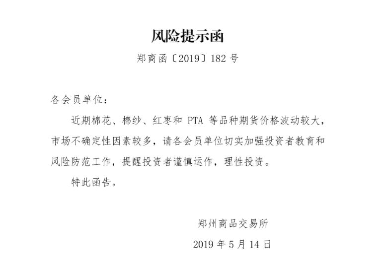 近期棉花、棉紗、紅棗、PTA等品種期貨價格波動較大,市場不確定性因素較多,請各會員單位切實加強投資者教育和風險防范工作,提醒投資者謹慎運作,理性投資。