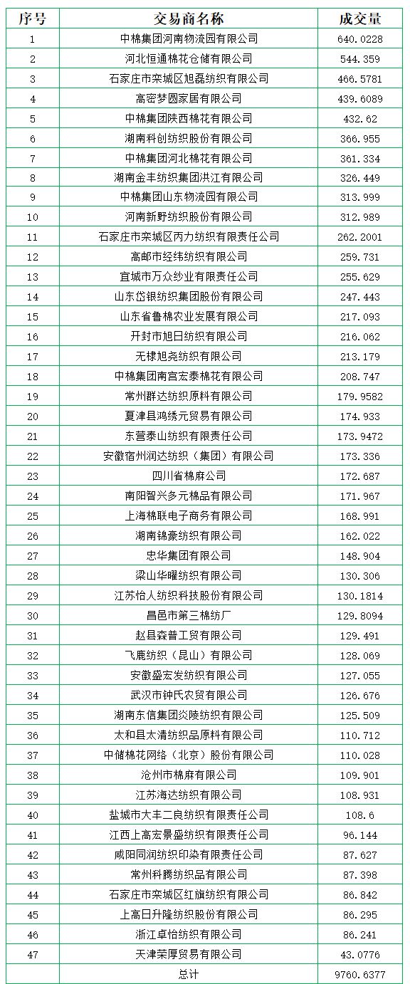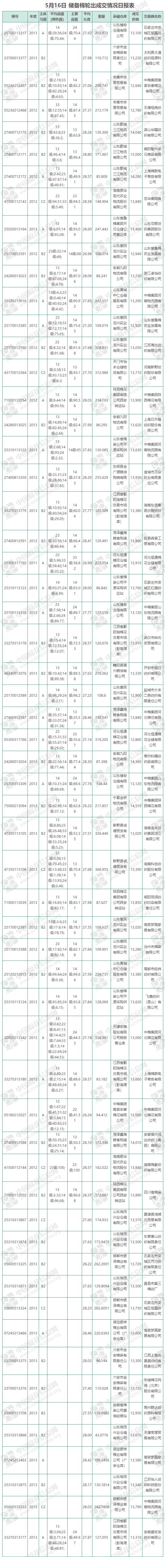 5月16日儲(chǔ)備棉輪出銷(xiāo)售資源10949.1115噸,實(shí)際成交9760.6377噸,成交率89.15%,成交均價(jià)13491元/噸,較15日上漲27元/噸;折3128價(jià)格14866元/噸,較15日下跌22元/噸。