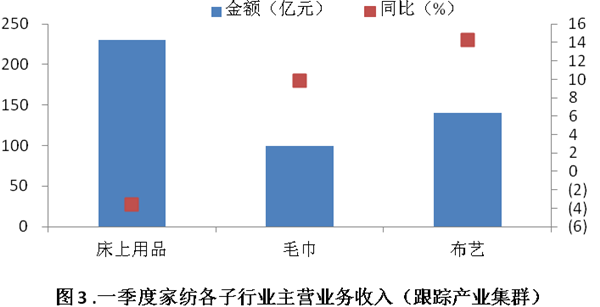 從家紡各子行業(yè)情況看,床上用品行業(yè)1季度主營業(yè)務收入相對有所回落,協(xié)會跟蹤的4個床上用品產(chǎn)業(yè)集群1季度實現(xiàn)收入230.69億元,同比下降3.56%;跟蹤的107家床品企業(yè)主營業(yè)務收入同比下降1.80%。毛巾和布藝行業(yè)整體保持平穩(wěn)較好增長。各統(tǒng)計口徑下的家紡子行業(yè)收入情況如圖1-圖3。