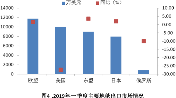 由于受中美貿(mào)易摩擦影響,1季度涉稅地毯產(chǎn)品出口美國市場同比下降27.32%,出口金額1.00億美元,在同類出口產(chǎn)品中降幅最大。與此同時,對歐盟、日本及東盟市場地毯出口實現(xiàn)較好增長。(見圖4.)