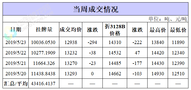 截至5月23日累計(jì)輪出銷售資源16.38萬(wàn)噸,成交最高價(jià)15930元/噸,成交最低價(jià)11890元/噸。