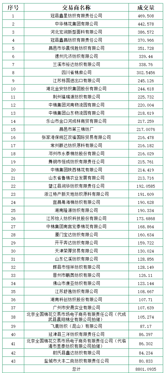 新疆棉成交均價(jià)13359元/噸,新疆棉折3128價(jià)格14447元/噸,新疆棉加價(jià)幅度554元/噸。