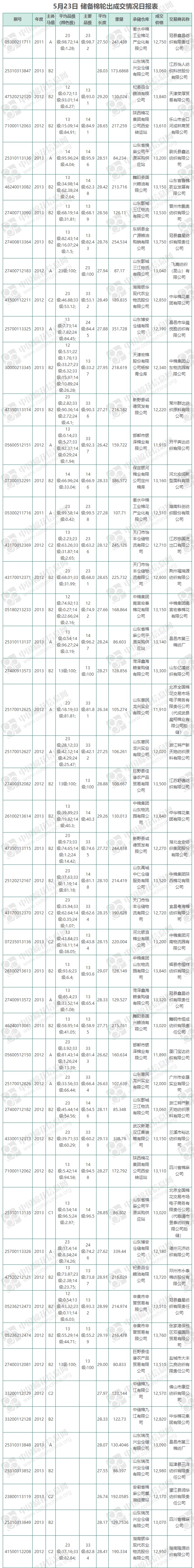 5月23日儲(chǔ)備棉輪出銷售資源10036.053噸,實(shí)際成交8801.0935噸,成交率87.69%,成交均價(jià)12938元/噸,較22日下跌294元/噸,折3128價(jià)格14310元/噸,較22日下跌222元/噸。
